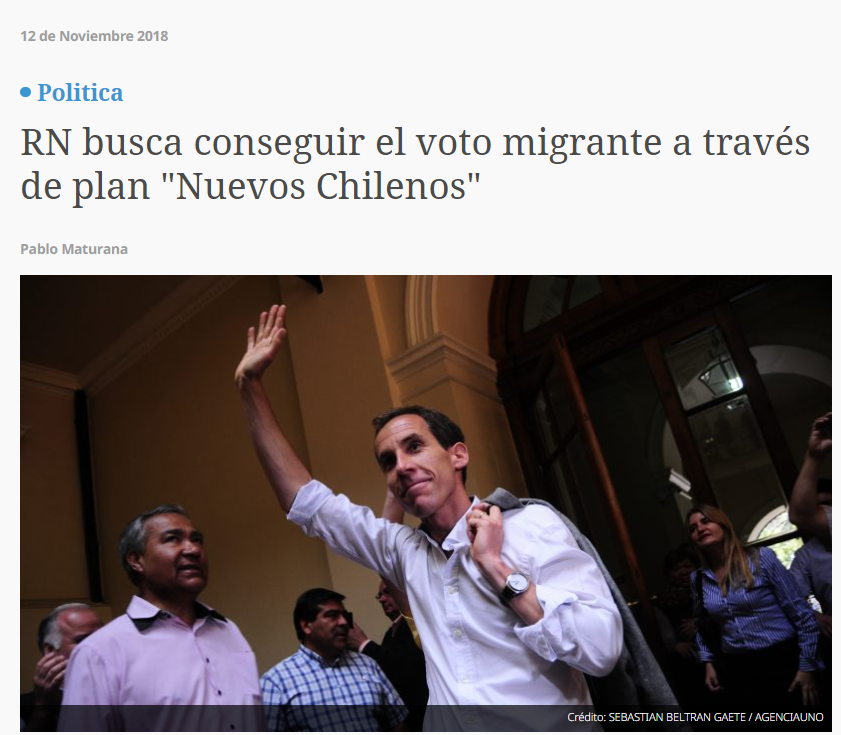 Santiago, noviembre de 2018. Mario Desbordes, presidente de Renovación Nacional, acaba de anunciar el lanzamiento de «Nuevos Chilenos», una iniciativa con la que el partido busca integrar formalmente a los inmigrantes naturalizados como actores políticos activos. La noticia circula en medios: RN busca el voto migrante. Lo que los medios no cuentan todavía es quién está detrás de la estructura.